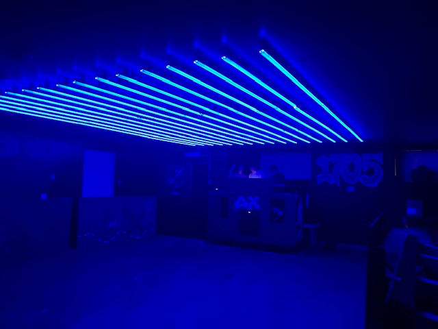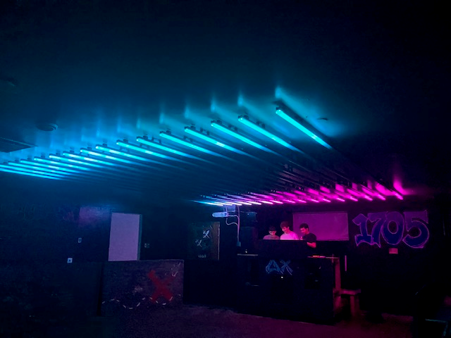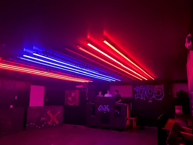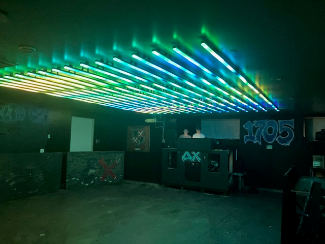 Imagine this: ceiling-to-ceiling neon light bars, 16 rows deep, stretching more than 20 feet each — over 18,000 programmable LED pixels glowing, chasing, and pulsing in rhythm with the beat. The entire system can shift through color palettes and patterns that would make any Ann Arbor club jealous. A custom-built DJ booth anchors one wall, giving the actives full command of both the music and the light show.